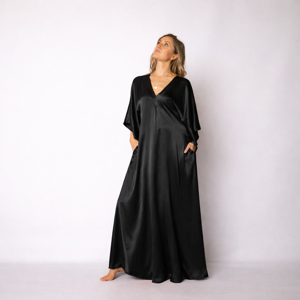 A bohemian-style dress with a voluminous silhouette, flattering V-neck and open back, wide side pockets, and a soft satin feel with an elegant sheen.